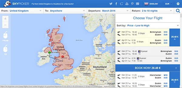 لمحبي السفر واكتشاف العالم ، هذه الخدمة ستساعدكم في العثور على أرخص ثمن لتذكرة طيران الى اي مكان في العالم .الخدمة تتميز عن باقي الخدمات بعرض خريطة تفاعلية ، كما تقوم بتحديد موقعك، وبالتالي، معرفة البلد الذي تتواجد فيه ، ومن ثم يعرض قائمة الأماكن المتاحة ومرتبة حسب تذكرة الأغلى،يمكن كذلك تغيير مواعيد السفر، والبلد والمدينة،وغيرها من المعلومات الأخرى في نفس المكان على الصفحة.